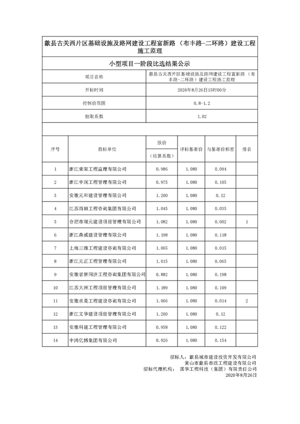 歙县古关西片区基础设施及路网建设工程富新路(布丰路-二环路)建设工程施工监理小型项目一阶段比选结果公示