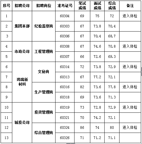黄山市徽城投资集团招聘员工面试工作已于2019年12月15日结束,现将面试成绩及最终综合成绩公布如下: