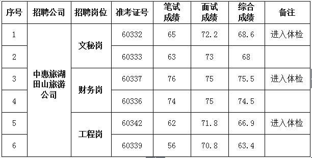 黄山中惠旅湖田山旅游开发有限公司招聘员工综合成绩公告