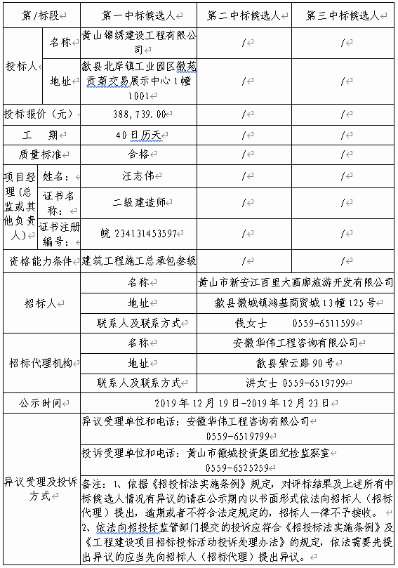 安徽华伟工程咨询有限公司受黄山市新安江百里大画廊旅游开发有限公司的委托,对(SXGC2019HWX092、歙县绵潭乡村小剧院改造工程)进行(小型项目招标),本项目于(20191219日)在(黄山市新安江百里大画廊旅游开发有限公司)开标、评标,现根据有关法律、法规要求,对中标候选人进行公示。