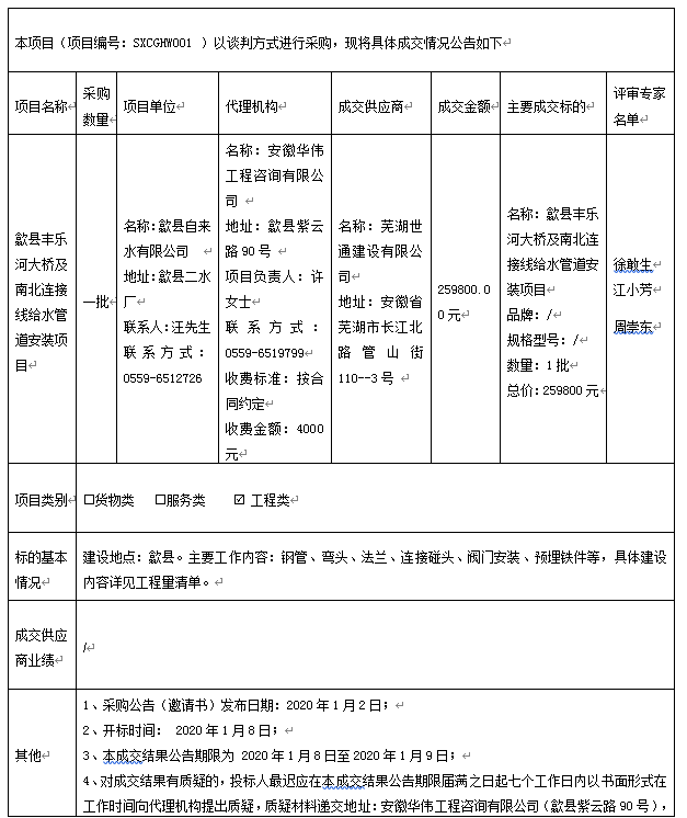 歙县丰乐河大桥及南北连接线给水管道安装项目成交结果公告