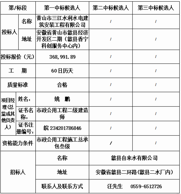 歙县雄村镇朱村供水安装附属土建工程 中标候选人公示