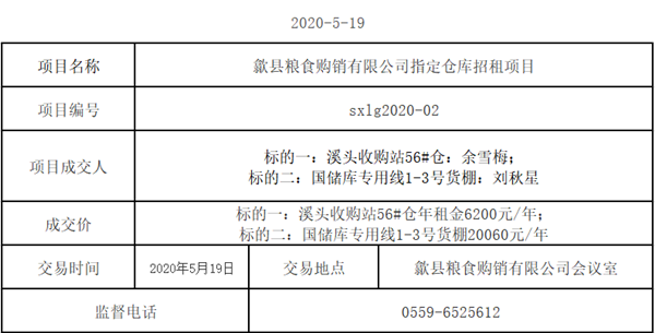 歙县粮食购销有限公司指定仓库公开招租成交公告