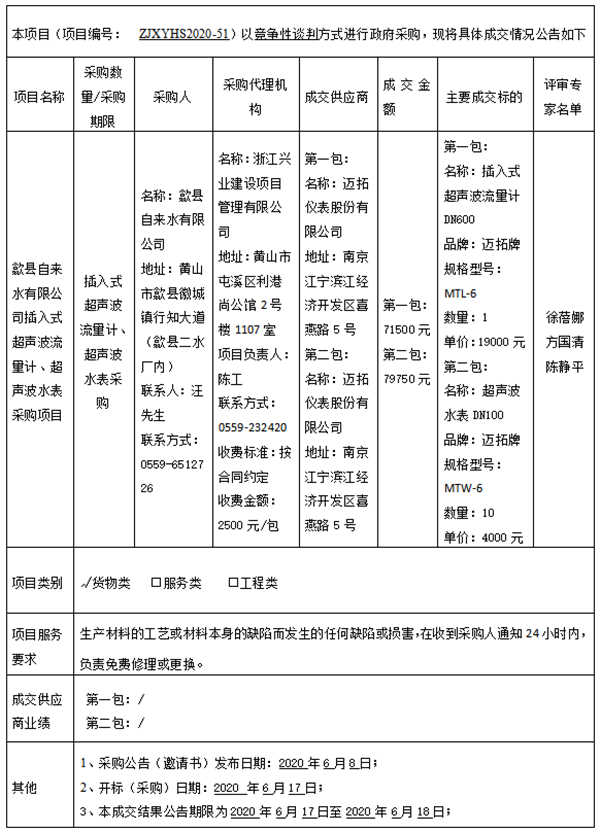 歙县自来水有限公司插入式超声波流量计、超声波水表采购项目成交结果公告