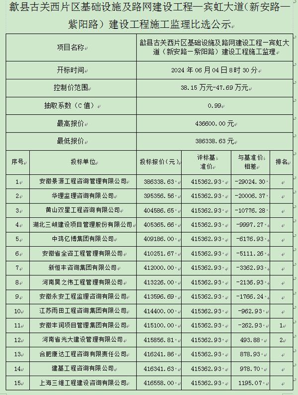 歙县古关西片区基础设施及路网建设工程—宾虹大道(新安路—紫阳路)建设工程施工监理比选公示